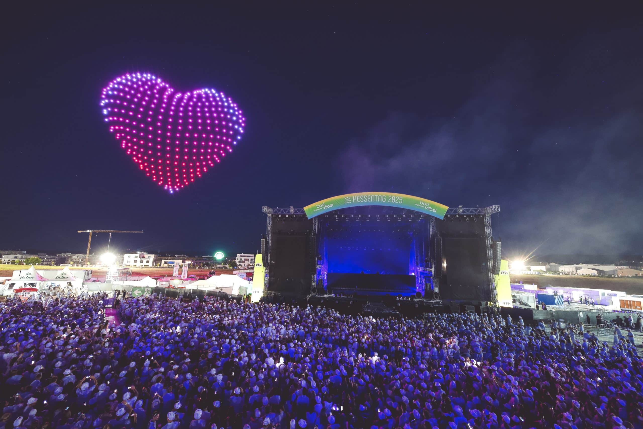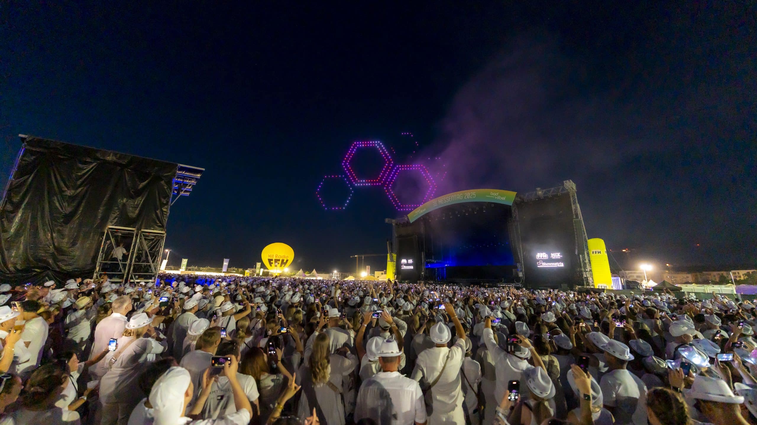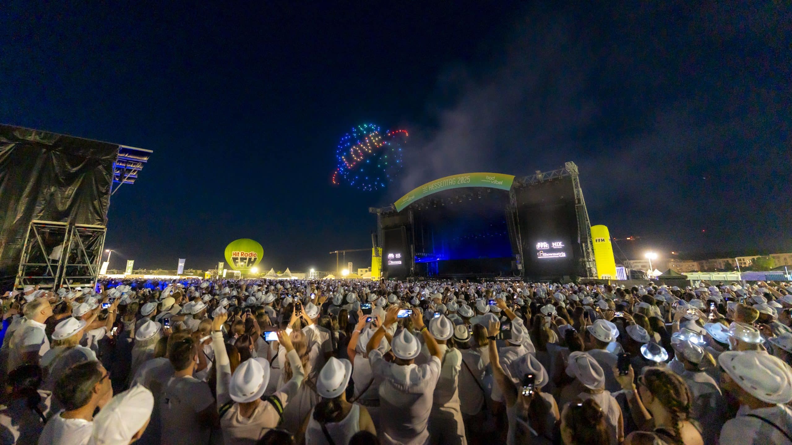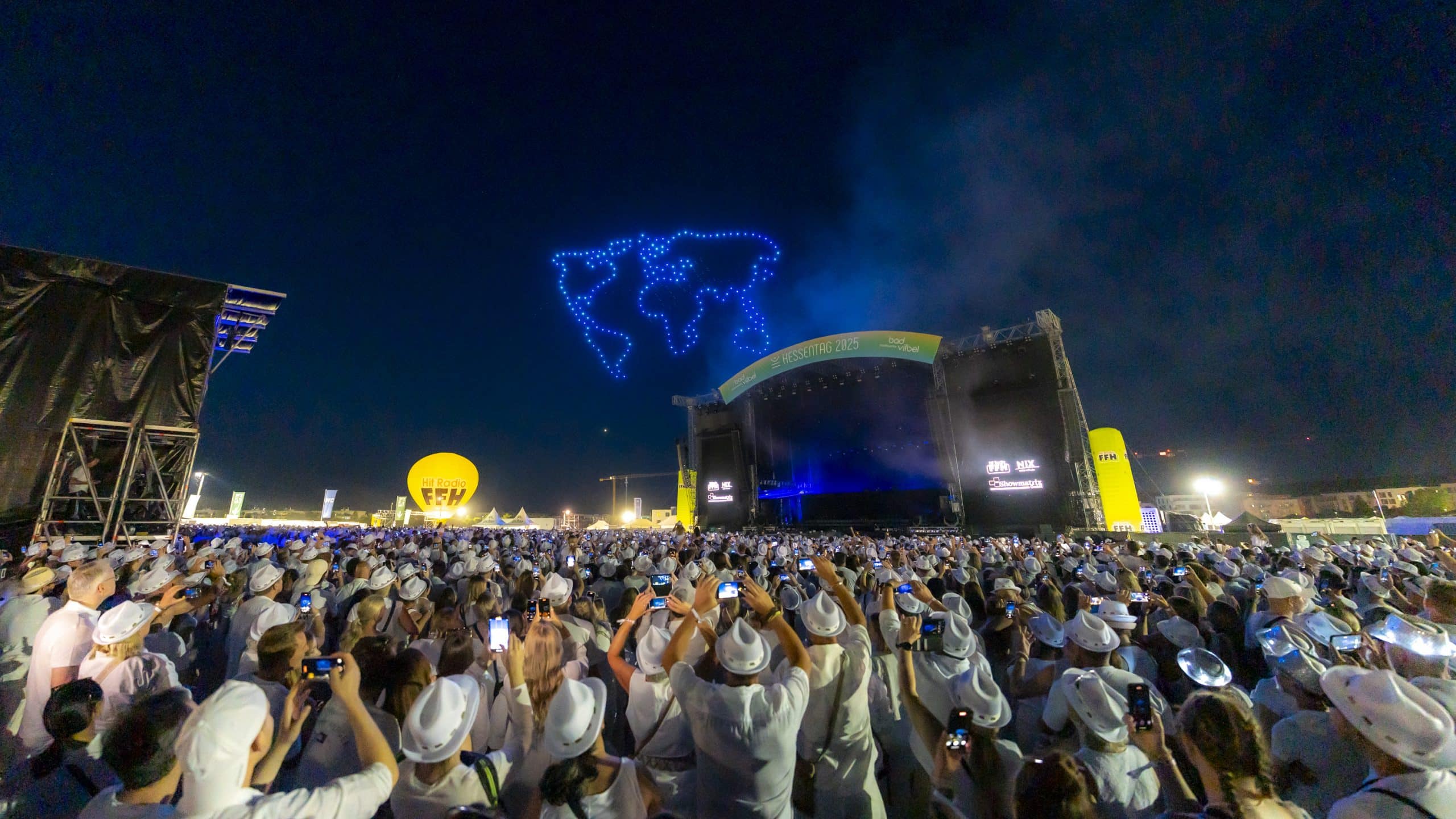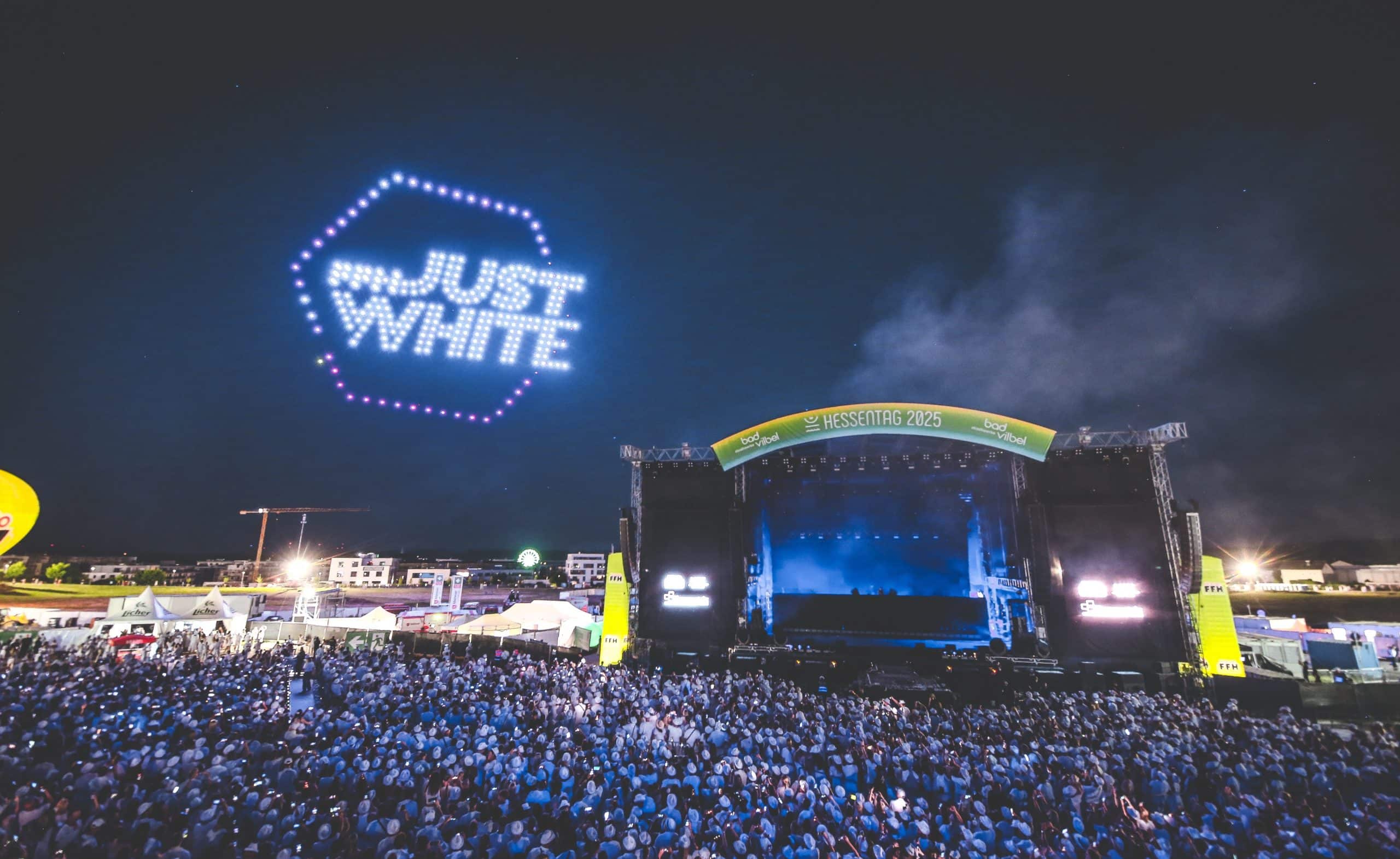 Wenn sich der Himmel über Bad Vilbel in ein leuchtendes Kunstwerk verwandelt, ist klar: Showmatrix ist am Werk. Als visuelles Highlight der FFH Just White Party auf dem Hessentag 2025 in Bad Vilbel begeisterte die Drohnenshow von Showmatrix tausende Besucherinnen und Besucher. In einer eigens entwickelten Inszenierung verwandelten hunderte leuchtende Drohnen den Nachthimmel in eine atemberaubende Bühne aus Licht, Bewegung und Musik.